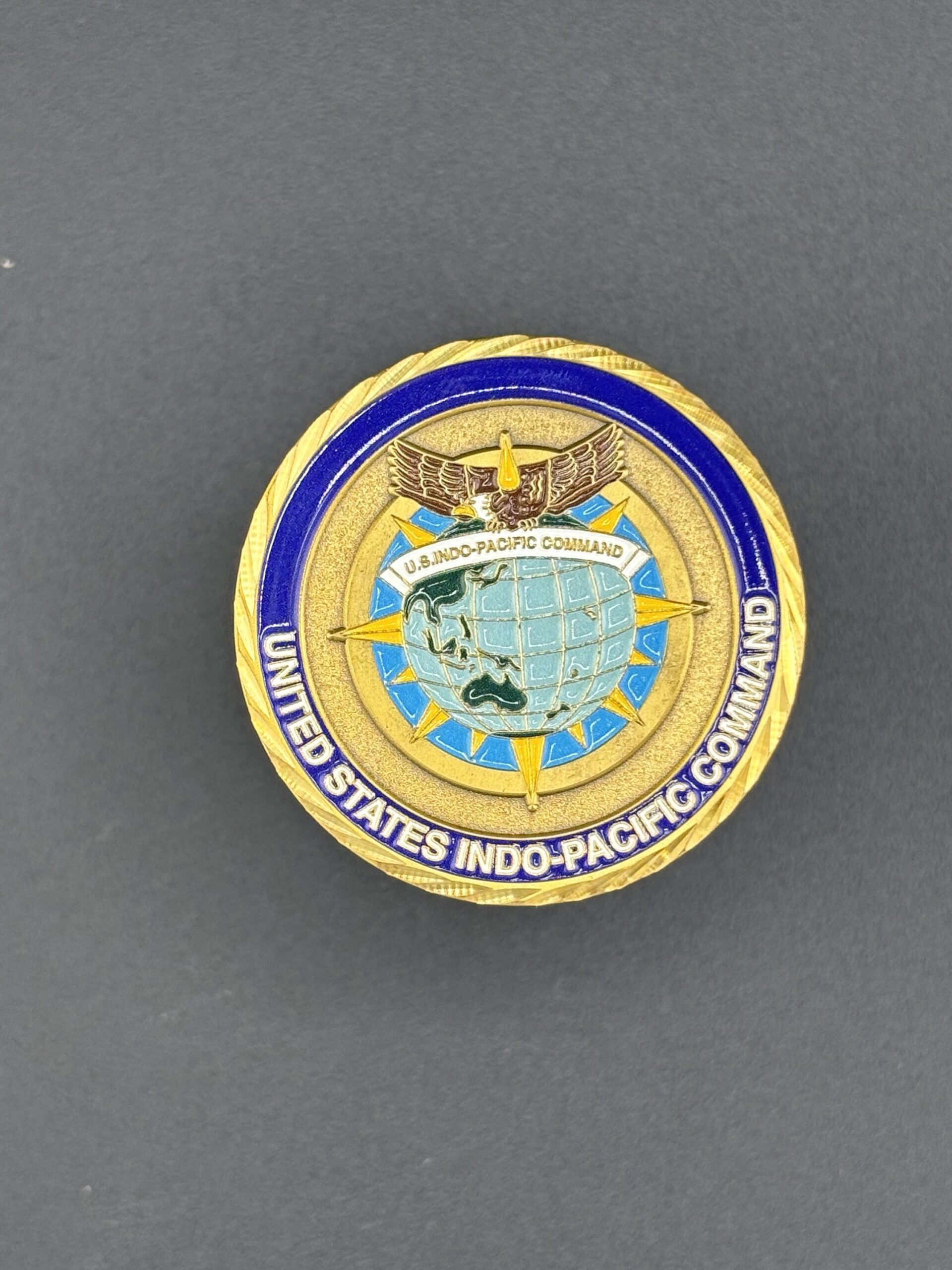 A durable, die-struck coin recognizing HQ INDOPACOM J7. Crisp metal relief with soft-enamel color and antique finish for high contrast and detail.